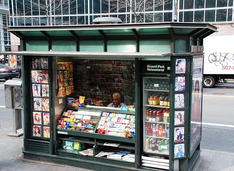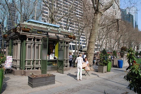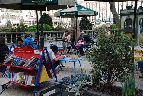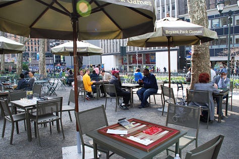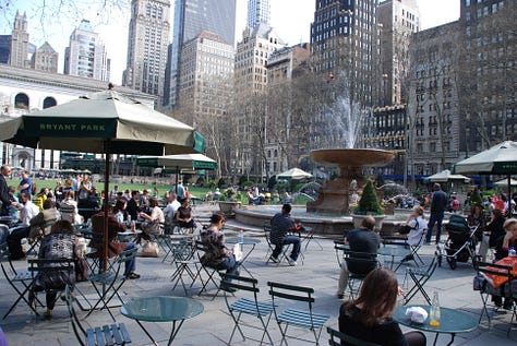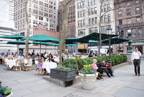 But lets take a step back and take a look at some images I took of Bryant Park in New York City (below) a few years back. Named after the poet and editor William Cullen Bryant, it is located in the heart of the city at the back door of the main branch of the public library. It has a rich history, starting with the 17th century. In the 1930’s a new layout included lawns and promenades, but by the 1960’s it fell into serious decline becoming crime-ridden and a serious blight on the neighborhood. A major redesign in 1988-92 brought new life to the square. Fast forward to today: Bryant Park is one of the busiest and most successful urban parks in the world, hosting outdoor movies, fashion shows, and seasonal markets. Landscaping is a balance between paved and green zones that accommodate areas for chess, ping pong, cafes, bars, and an area just for children. And, what’s that? A newsstand? Of special note: The Bryant Park Corporation, formed in 1980, stands as a model for public-private partnerships. I would also add, a model for good urban design.