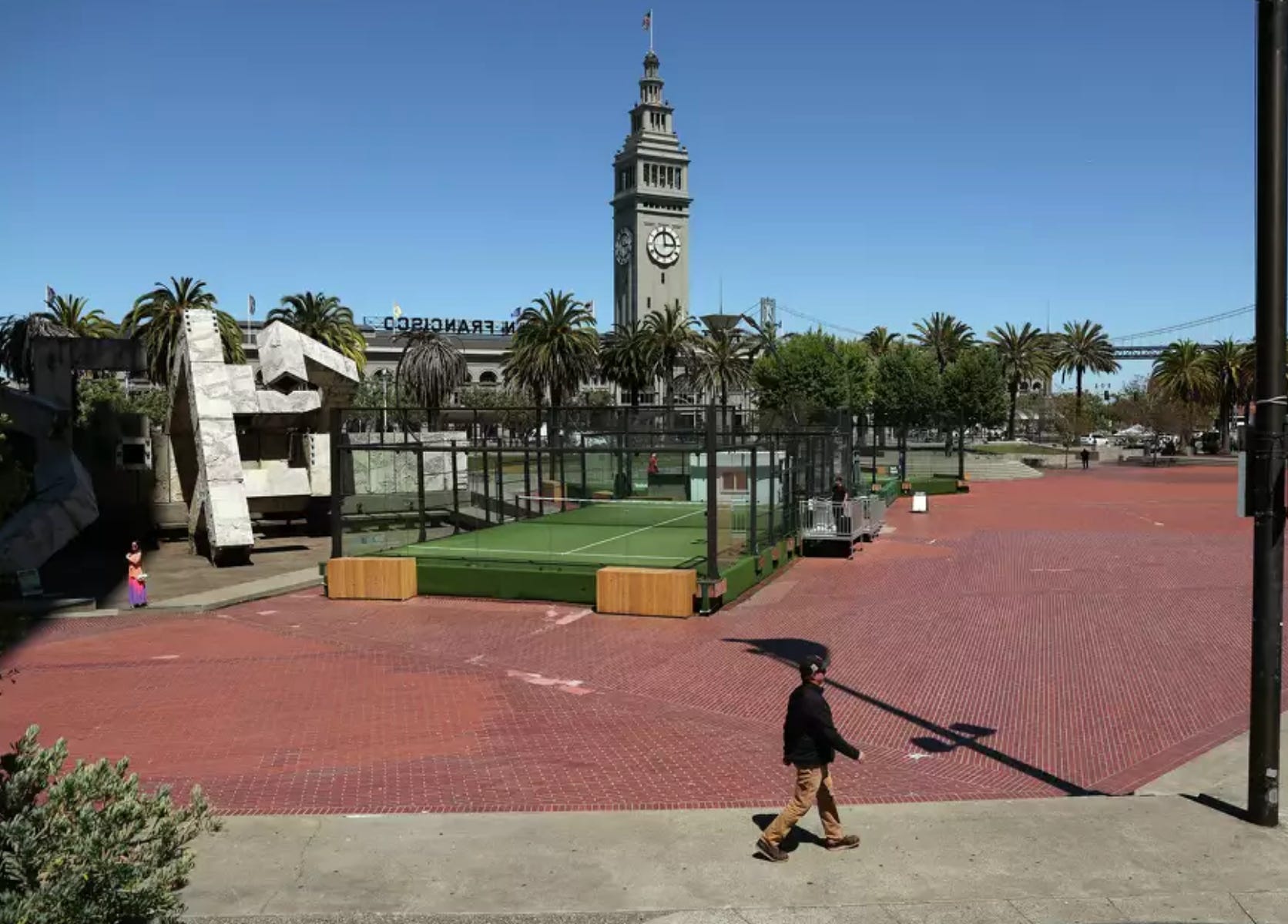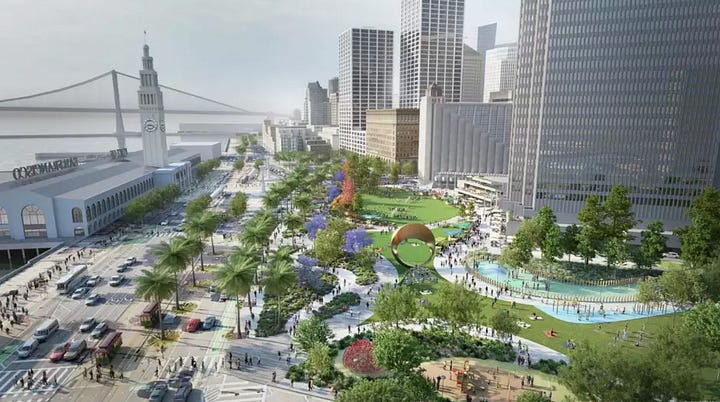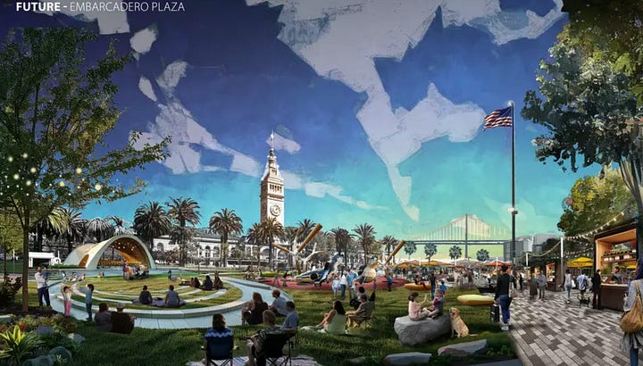 San Francisco has world-admired scenery, vistas, and open spaces. The new parks in the Mission Rock and Mission Bay neighborhoods along with Tunnel Tops in the Presidio all add gems to these exceptional assets. But there is still a noticeable lack of comfortable pedestrian havens that speak to the style and grace of European spaces. The Embarcadero Plaza project at the foot of Market Street gives hope for a park-like space scaled for residents, workers, and tourists to enjoy. Right now there is a mix of “things” (below) that degrade the plaza, including two padel courts, the tangled tubes of the Vaillancourt Fountain, and an ugly expanse of discolored and patched brick paving.