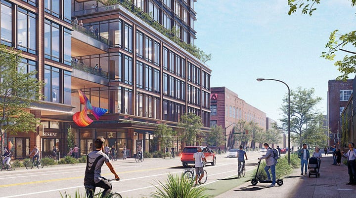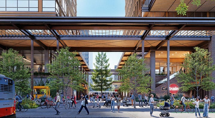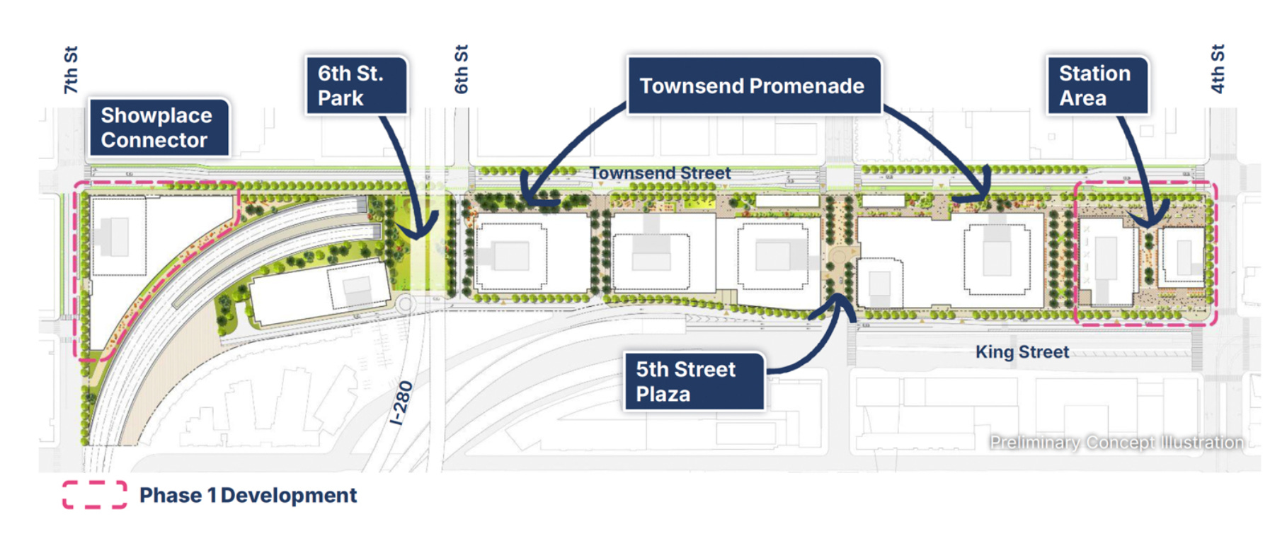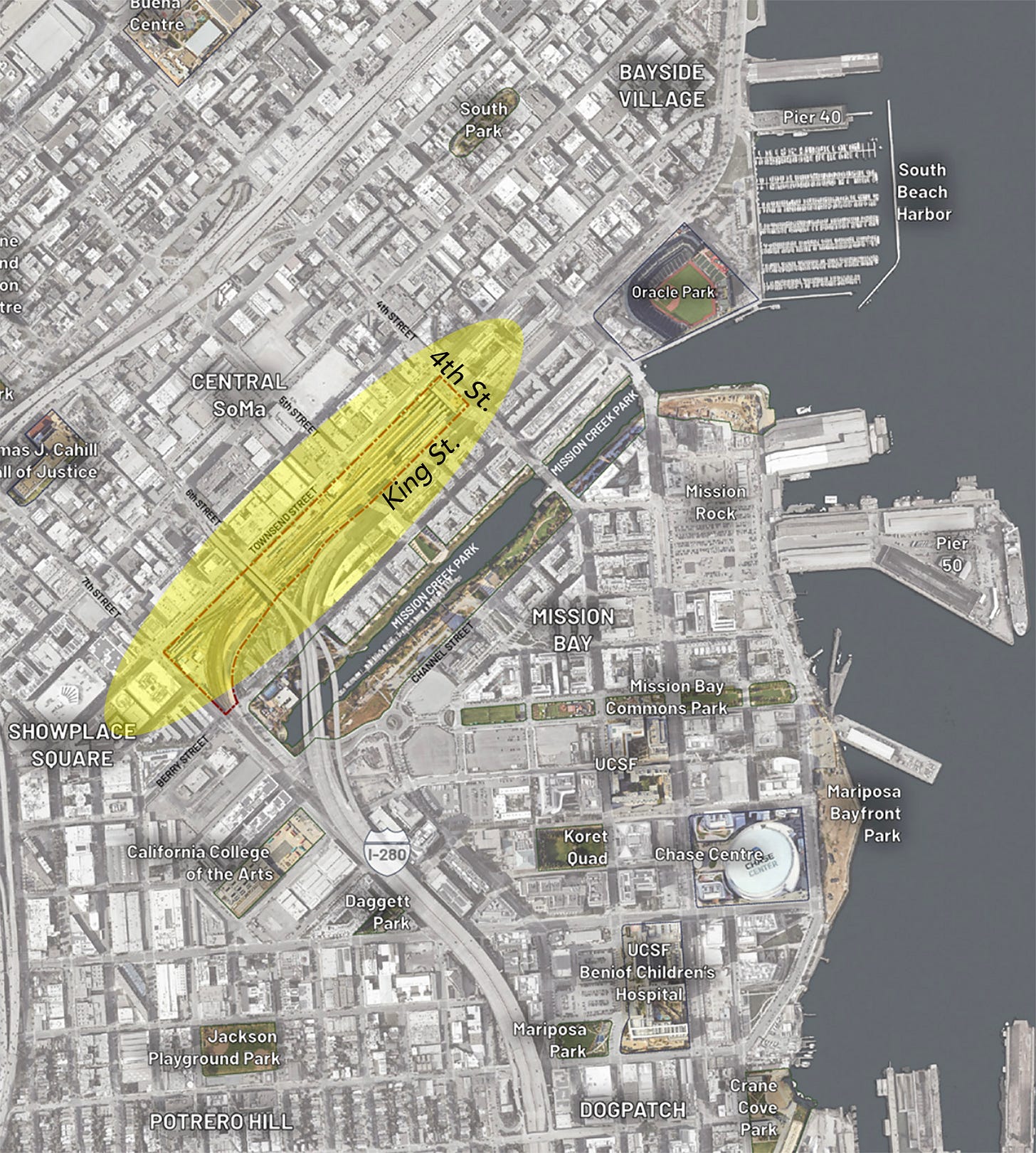 This project is right up there in terms of major importance in San Francisco as a gateway and mixed-use complex. Bounded by Mission Bay, Central SoMa, Oracle Park, and Showplace Square, it is linked to The Portal project which ultimately (and hopefully) will see Caltrain and High Speed Rail connected, underground, to the downtown Salesforce rail and bus terminal. Currently, the Caltrain station at 4th and King Streets is the front door to the site. Things have settled down a bit since the electrification of Caltrain. A fleet of sleek new trains has replaced the shabby diesel locomotives and passenger cars that used to test the nerves and health of the neighbors (and the pa