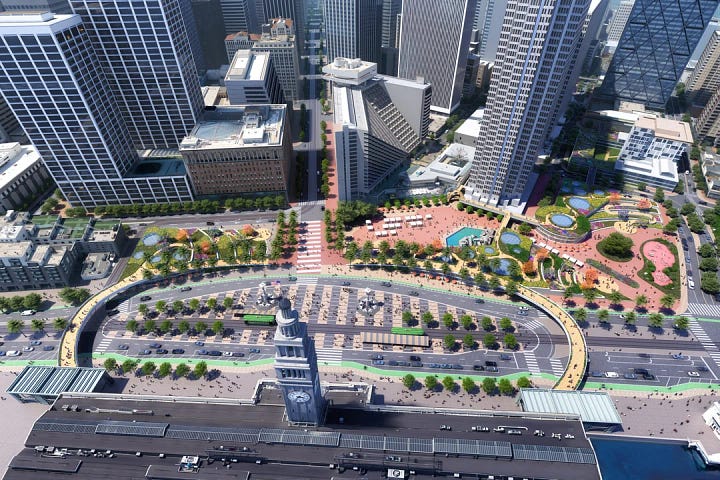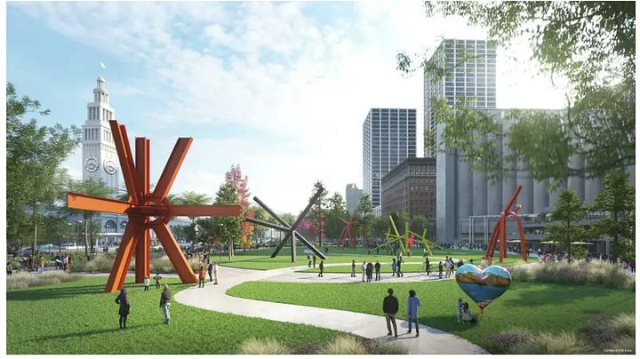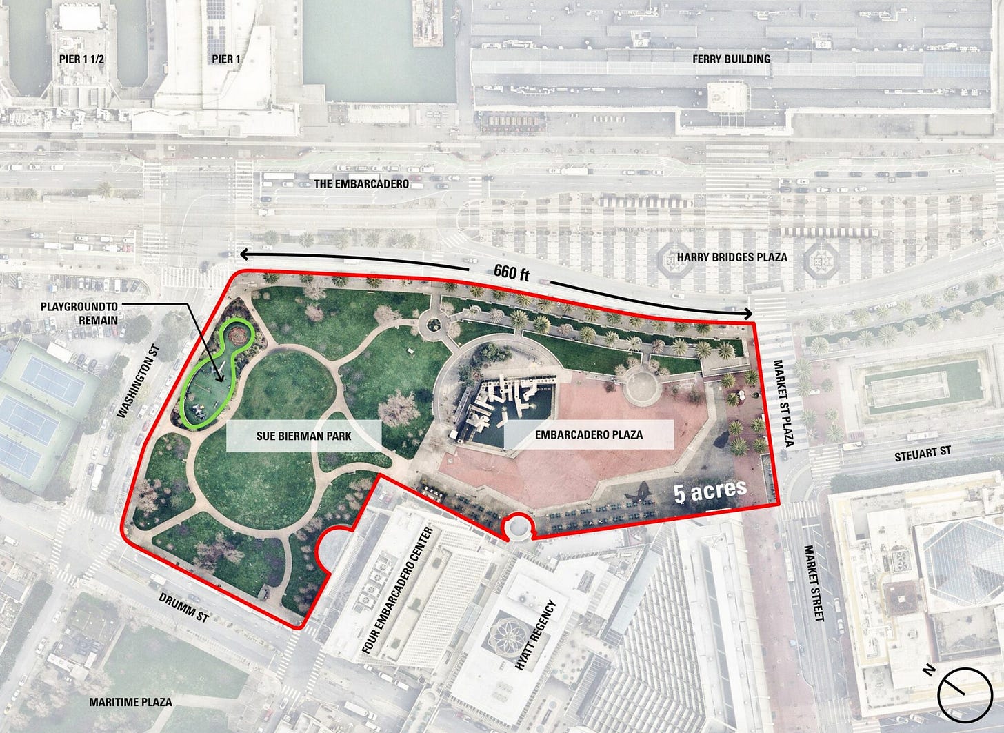 The owner of Embarcadero Center, BXP (formerly Boston Properties) and the City’s Park & Recreation Dept. have been working to explore a new bold concept for this 5-acre site which could give a big boost to the downtown revival. The boundaries would absorb the existing Sue Bierman Park, retaining the actively-used children’s playground. The site of the existing underused bocce court across the bottom of Market Street would ideally come into play as well, not to mention the totally underused Harry Bridges Plaza in the middle of the Embarcadero that fronts the Ferry Building and is currently a playground for skateboarders whose sport includes harassing pedestrians. Finally, what about those upper level promenades that wind their way through the four-building Embarcadero complex. I used to spend my lunch hour eating among the pleasant greenery and varied views on one of the levels. Why not rethink the contribution that important network of pedestrian ways offers.