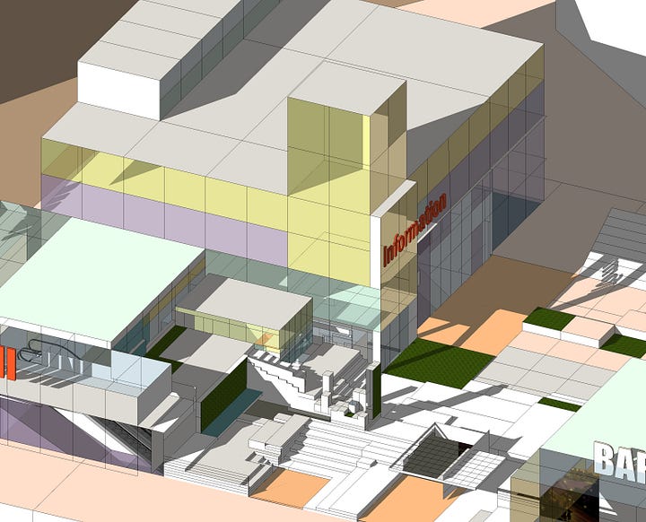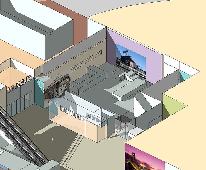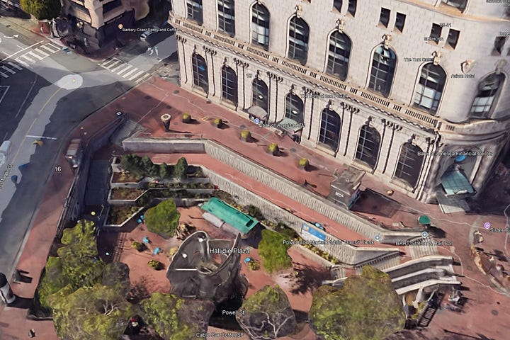 A few years ago, I said okay, I’m going to take a whack at it and developed a series of 3D views (this was way before AI) of what might happen if it were to become something. Again, we’re talking conceptual only here. The scheme included a sizable information center, enclosed stations for both BART and Muni, a plaza for relaxing and events, a below-grade transit museum, and landscaped areas. The development was to be funded from the sale of air rights over the two city-owned parcels that straddle Cyril Magnin Street. A public-private entity was to be established for the whole development. I showed my concept to authorities oat the Union Square Alliance and SPUR (formerly the San Francisco Planning & Urban Research Association). It got a positive reception, but, clearly there would need to be an overriding entity that had the horsepower to put such a complicated package together. Maybe it’s time to knock on Mayor Lurie’s door. We desperately need a better face on transportation in the region to bring in more riders and to finally make something of this site.